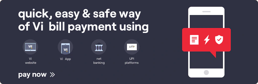 Vi offers a convenient and secure way of online bill payments for its postpaid users. The hassle-free bill payment process is faster and available 24*7. You no longer need to wait in queues or for someone's assistance to pay bills online. Users can pay bills effortlessly via the Vi App or Vi website.