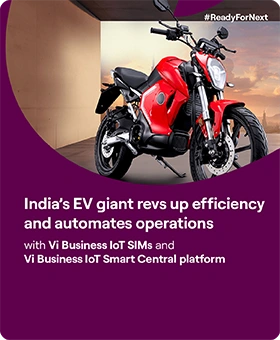 - Our IoT SIM solution provided real-time visibility into vehicle performance and health, helping the EV giant to improve operations. It enabled remote monitoring of battery health and diagnostics, enabling informed decision-making. - Vi Business’s IoT Smart Central Platform enabled them to manage & control their IoT SIMs seamlessly in real time, cut operational costs, and automate various operational tasks.