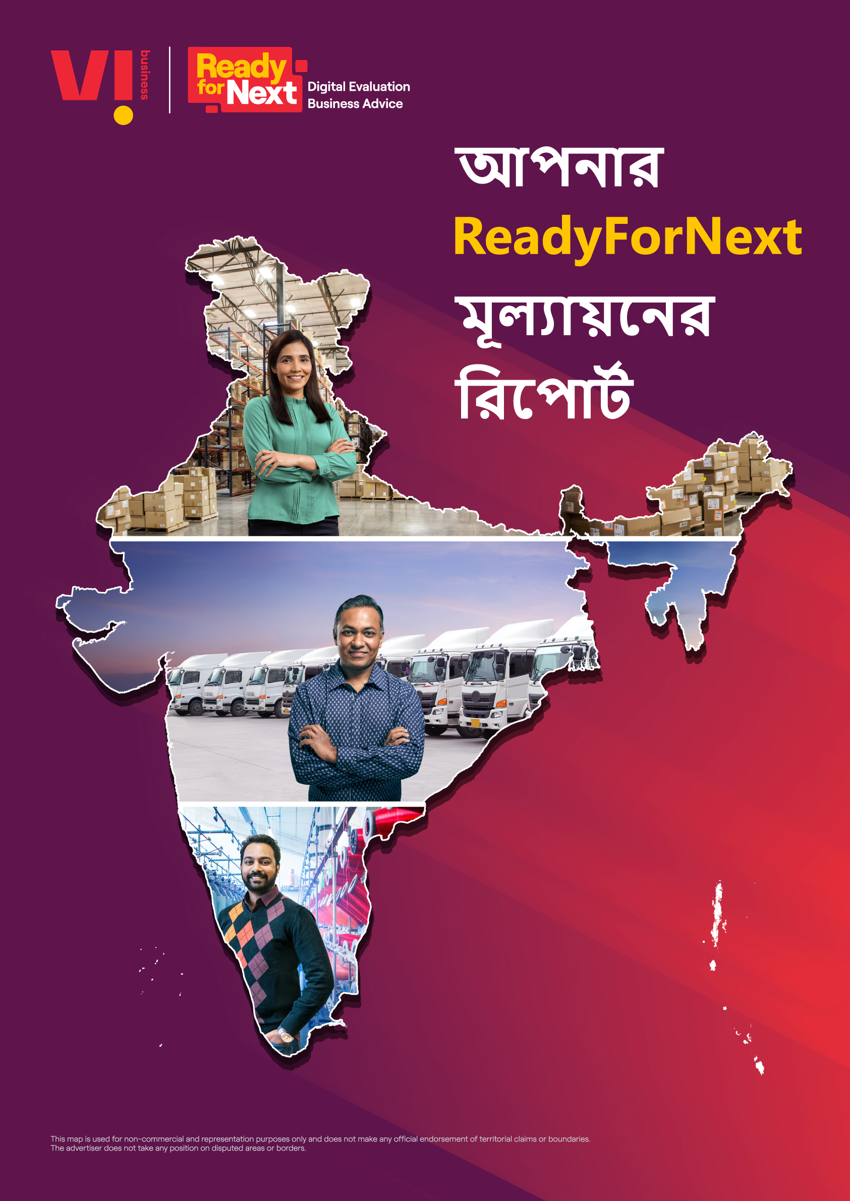 দাবিত্যাগ: যেসব উত্তরদাতা এই টুল ব্যবহার করছেন শুধু তাদের জন্য এই ReadyForNext স্কোর এবং Vi Business এর তৈরি করা একটি অভ্যন্তরীণ মডেল অনুসারে, Ready for Next মূল্যায়নের টুলে রেকর্ড করা উত্তরের ভিত্তিতে এর হিসাব করা হয়েছে। এই দলিল ব্যবহারকারী যে সিদ্ধান্ত নেবে সেসব ঐ ব্যবহারকারীর নিজস্ব ধারণার ভিত্তিতে নিতে হবে, এবং এই প্রকারের সিদ্ধান্তের জন্য Vodafone Idea Limited কোনওপ্রকারে দায়বদ্ধ থাকবে না।