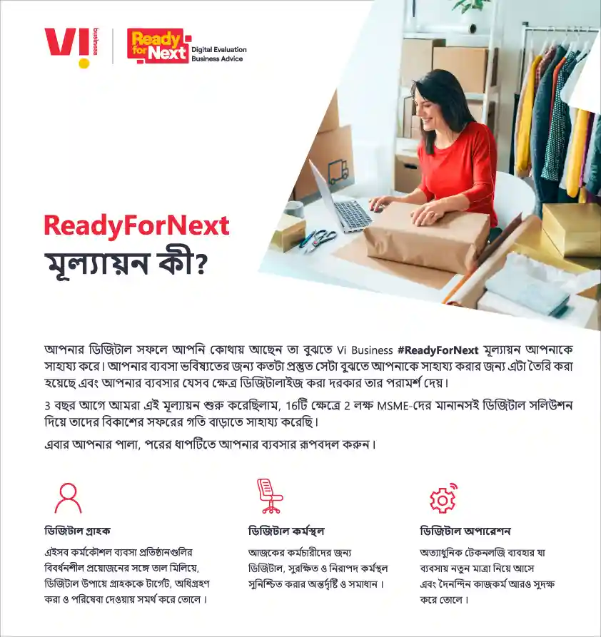 আমাদের যেসব সলিউশন আপনার ব্যবসা Ready for Next করে তুলবে তার ব্যাপারে আরও জানতে myvi.in/business দেখুন।